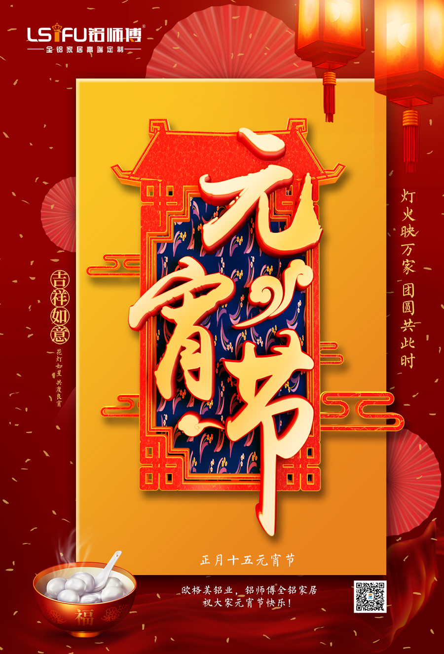 燈火映萬家,團圓共此時。歐格美鋁業、鋁師傅全鋁家居全體同仁祝大家元宵節快樂,闔家幸福!