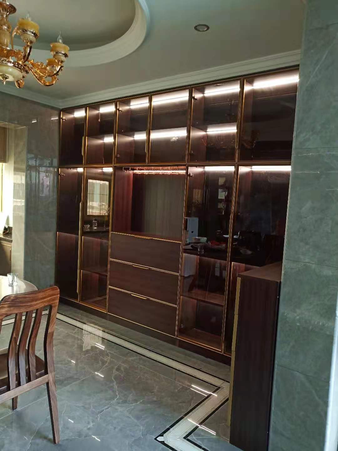 這是一套復式結構的房子,分上下兩層。上圖是餐廳的餐邊酒柜(拍照效果沒有實物漂亮),柜體是深色木紋色北歐紫檀,內(nèi)嵌感應燈帶,搭配金色20極簡窄框玻璃門,盡顯輕奢質(zhì)感!
