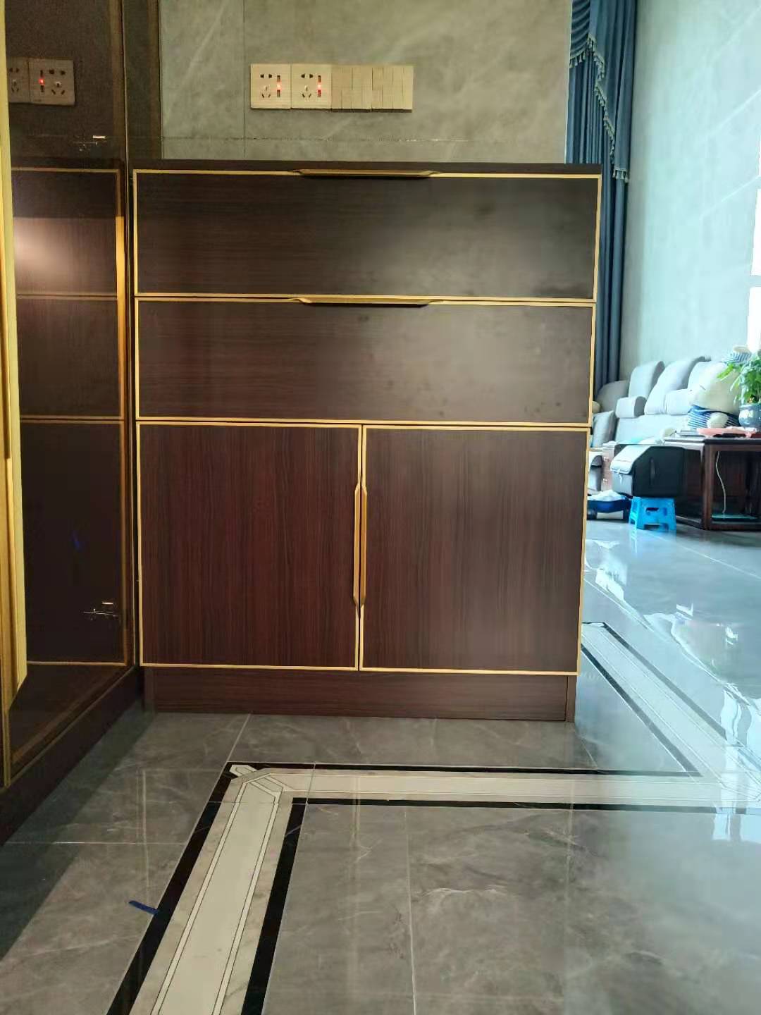 酒柜旁邊轉角做了個同色系手機吧臺小柜,方便手機充電,北歐紫檀柜門搭配金色拇指款銑型拉手與整個柜體拉手一致更和諧統(tǒng)一,也更顯檔次。抽屜放充電器、充電寶等瑣碎。