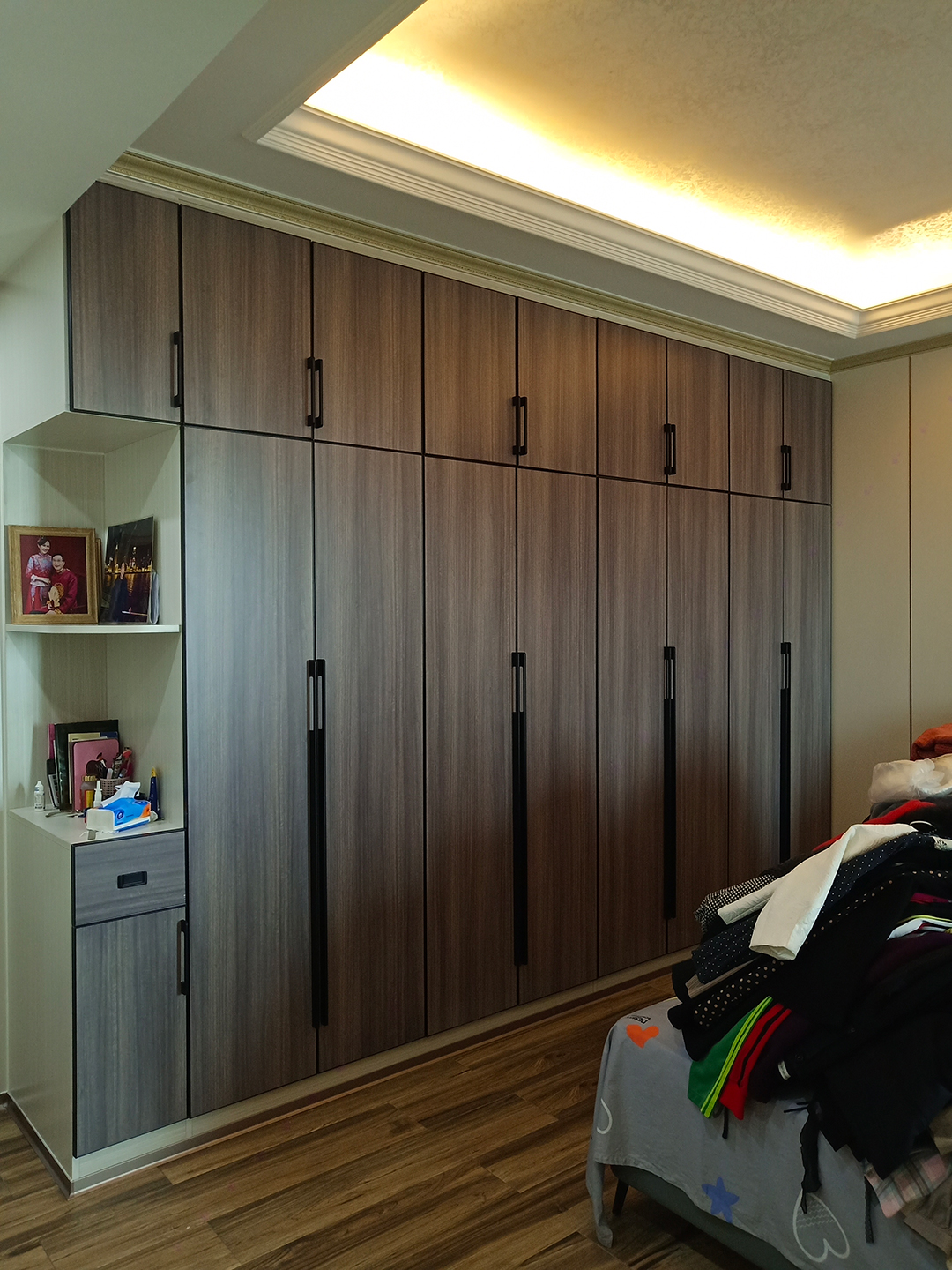 一樓主人房平開門衣柜,柜體是北歐書香桐,門板是今年新款顏色北歐松木灰,極簡門板搭配黑色一字拉手,穩(wěn)重大氣,靠門的一邊做了兩個開放格,放相框和常用的東西,整體不壓抑,更活潑。