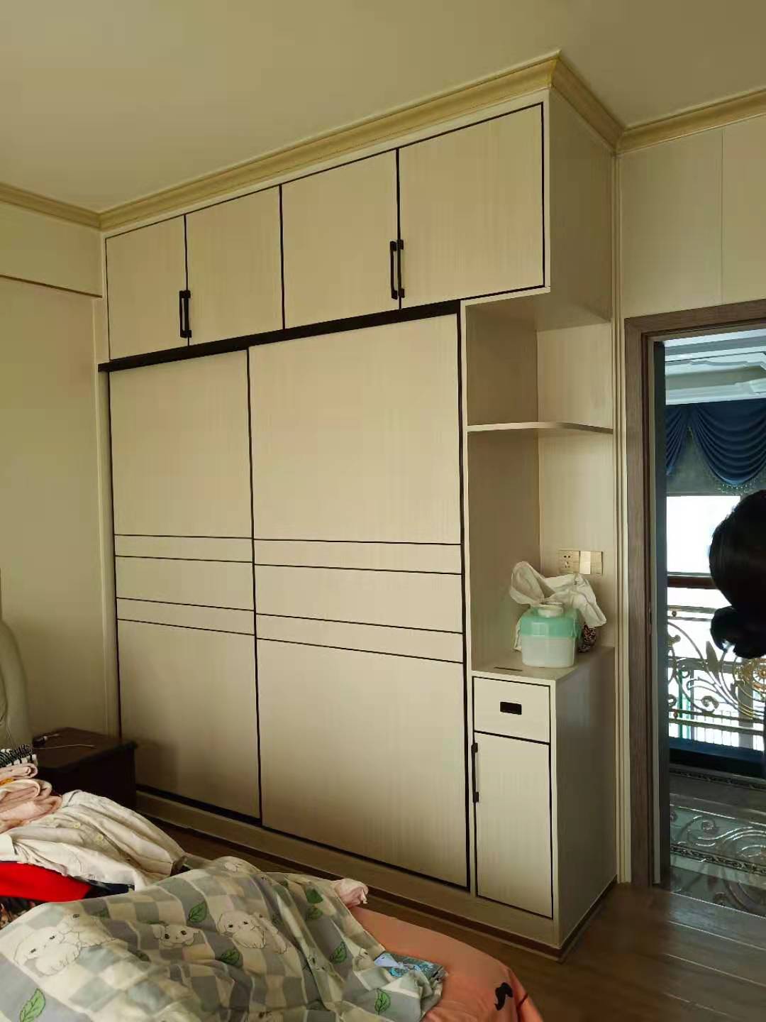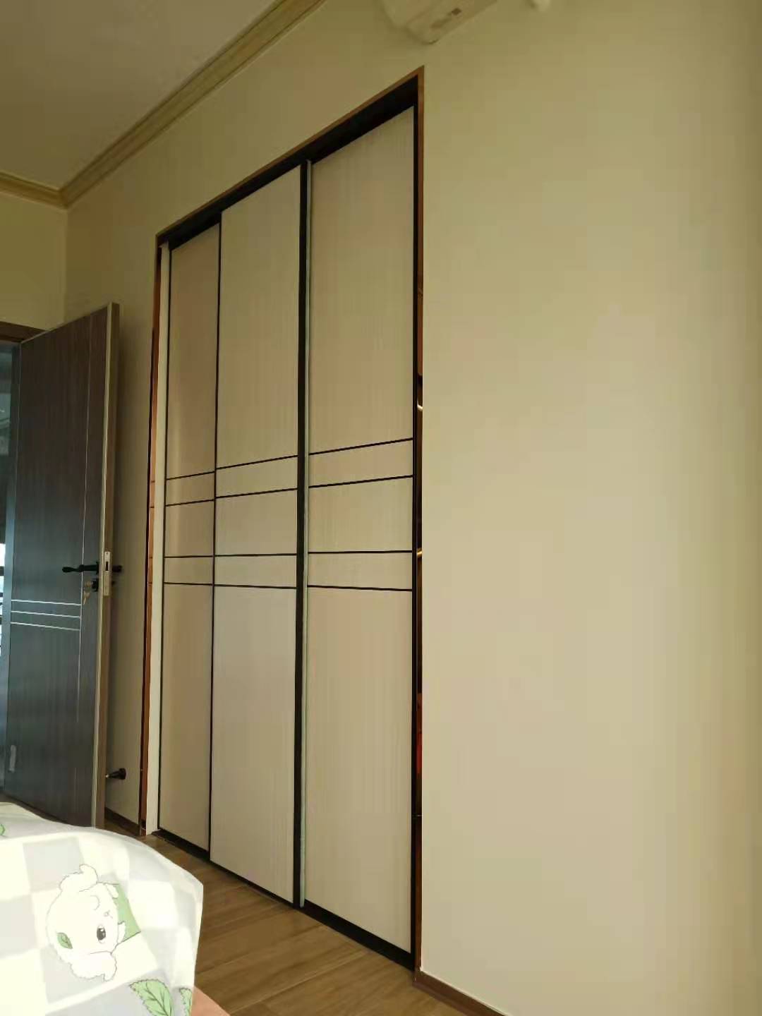 二樓兒子房比較大,做了兩個大衣柜,這是其中一個根據(jù)戶型定制的一個到頂轉角掩門衣柜,顏色和款式與主人房一致。