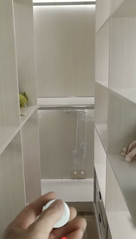 這是女兒房的一個隱藏式衣帽間,三扇移門里面是一個小型衣帽間,內(nèi)部容量超大,可放鞋子、包包等各種衣物。里面也裝了智能燈帶,用起來非常方便。