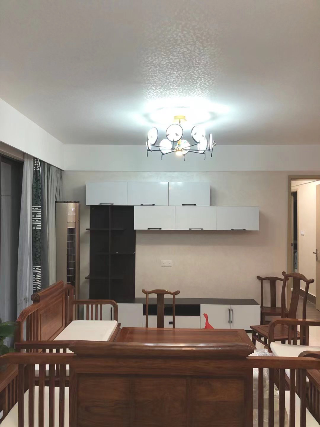 客廳的電視柜與餐邊柜色系一致,北歐紫檀柜體搭配天使白門板。電視柜采用側U型設計,左邊豎柜和上方吊柜做薄處理,豎柜中部做開放格,展示相框、書籍、綠植、工藝品等,地柜稍微做深一些,方便放一些隨手物品,更好的存放物品。