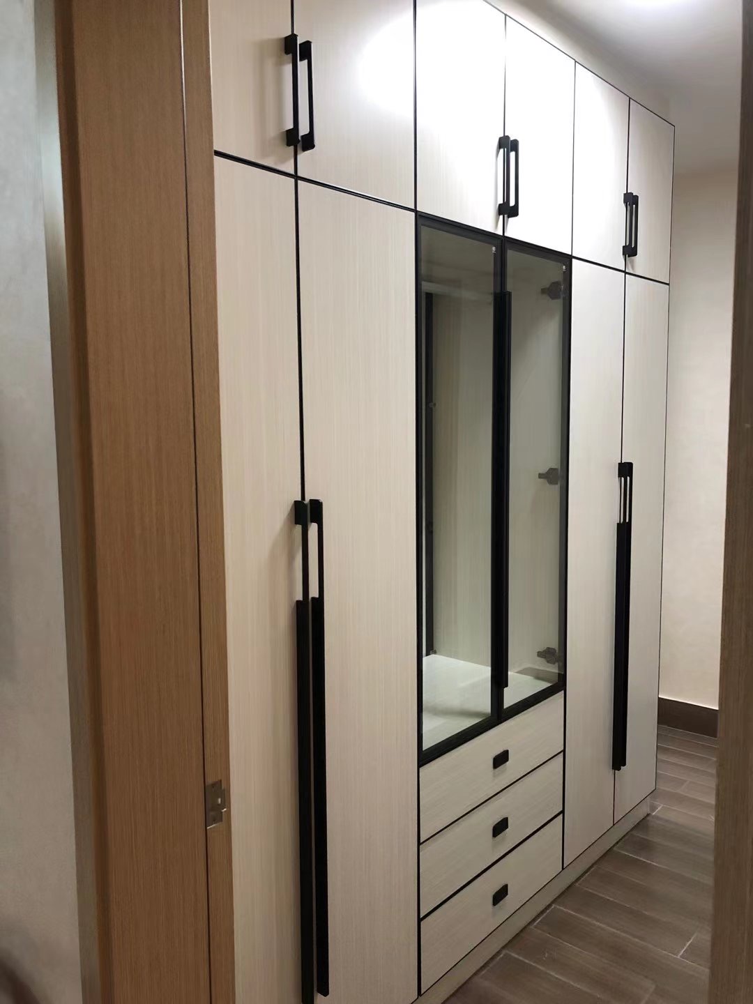 主臥掩門衣柜柜體和柜門都是北歐書香桐,白色系書香桐柜門搭配黑色長拉手,簡約大氣,中間用20極簡黑框玻璃門,整體不壓抑。