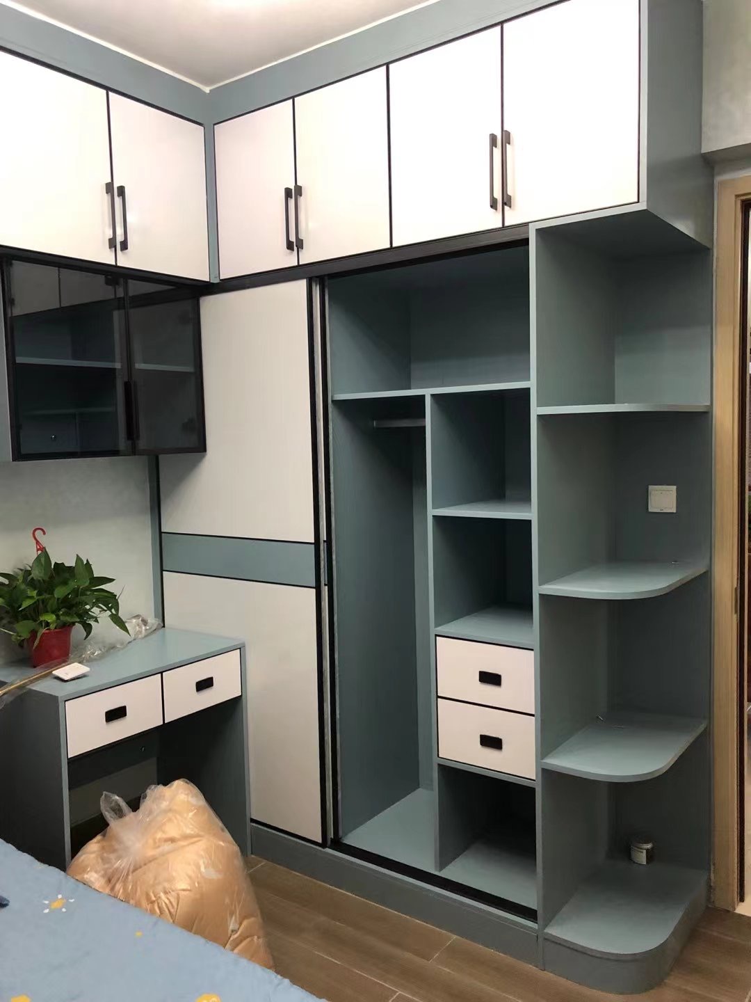 男孩房以藍色為主調,L型衣柜+書桌+吊柜組合結構,柜體采用肌膚藍,吊柜掩門和抽屜門用天使白搭配黑色拉手,衣柜移門用天使白搭配肌膚藍腰線,整體和諧統一。