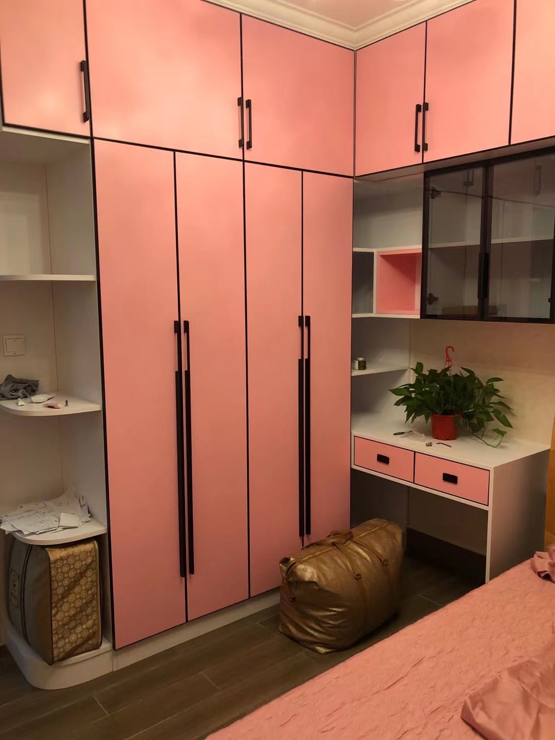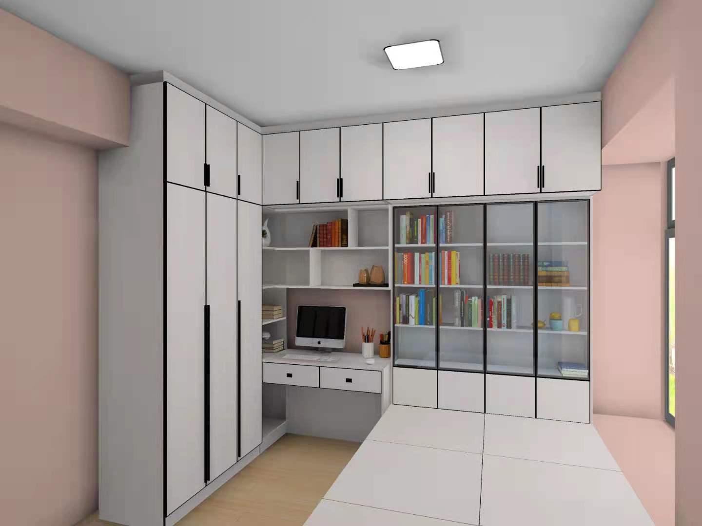 女孩房以粉色為主調,柜體顏色是北歐書香桐,柜門是公主粉,營造一個浪漫的公主夢空間,書柜用玻璃門,拿取更方便,整體顏值高且實用。