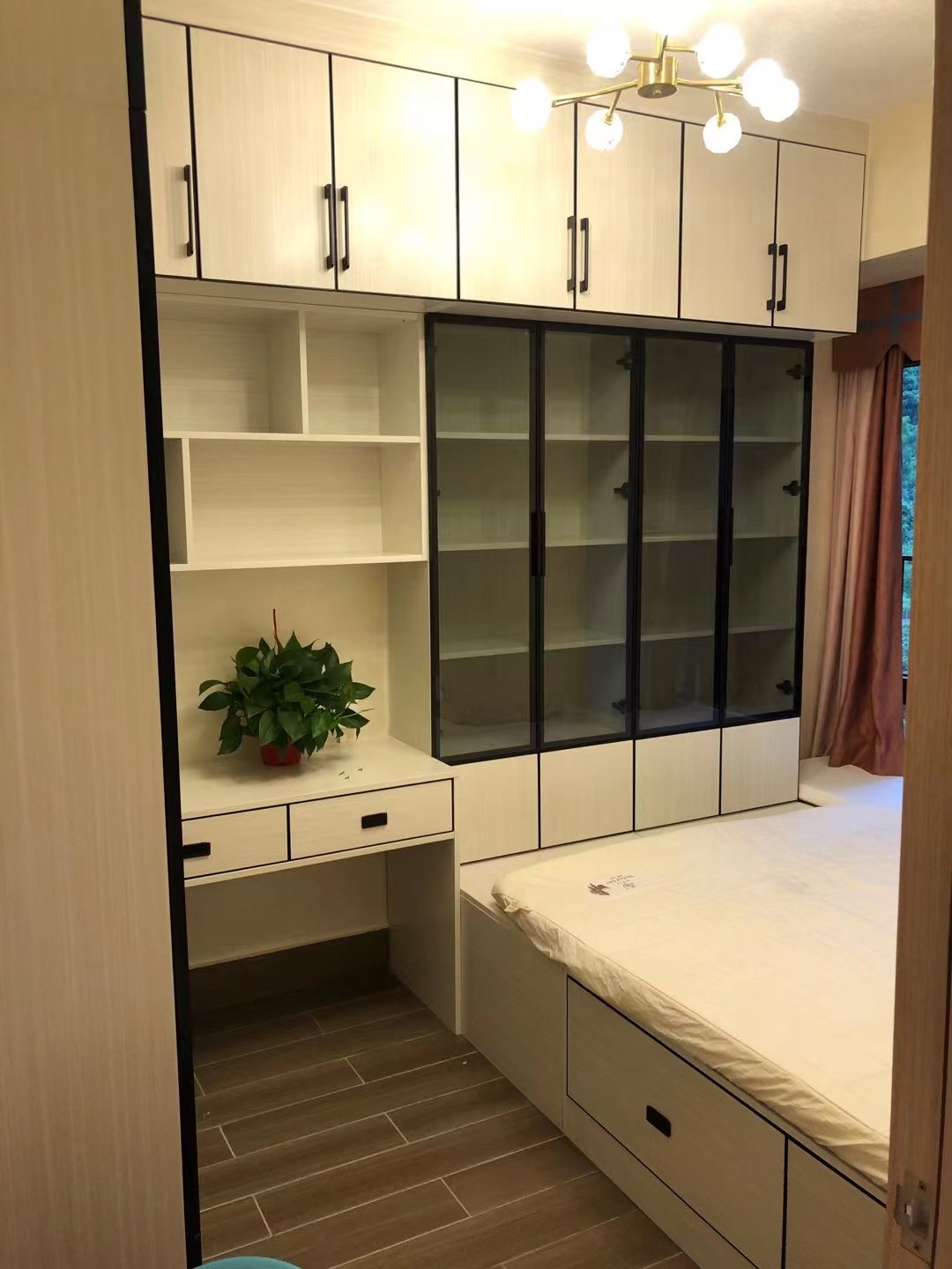 榻榻米底部設計抽屜,最大化的增加了收納功能,整體色系以北歐書香桐為主,黑框玻璃門做點綴,讓空間在視覺上更加的寬敞。