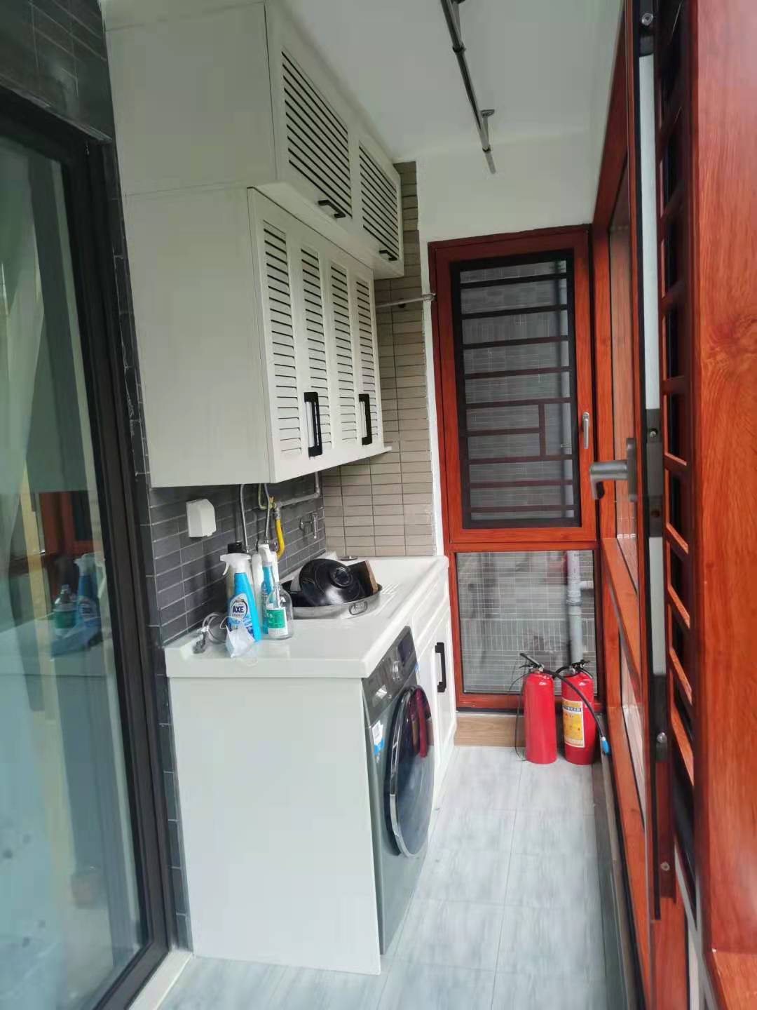 陽臺放洗衣機,洗完衣服可以直接晾曬,減少勞動動線。定制洗衣機柜可以把洗衣機嵌入柜身融為一體,整體美觀實用,吊柜用百葉門,可以把燃氣表隱藏起來,也可以增加收納。
