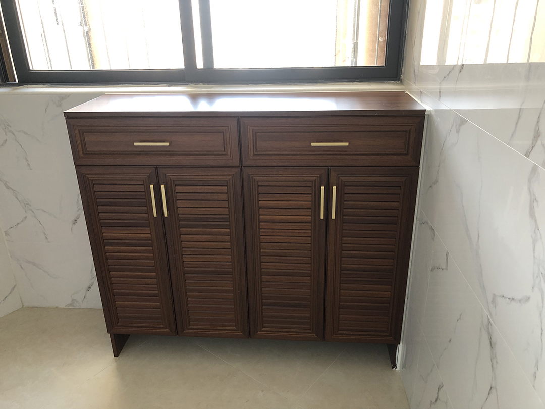 在客餐廳拐角處設計一個與窗齊平的簡易全鋁鞋柜增加全家人的鞋子收納,柜體和門板都是北歐柚木,真百葉門板設計,透氣佳!
