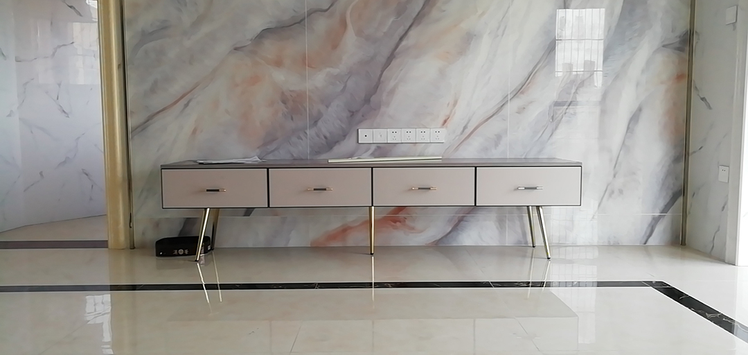 客廳做了個全鋁電視矮柜,膚感卡其門板搭配金色細腳底座盡顯輕奢質感。