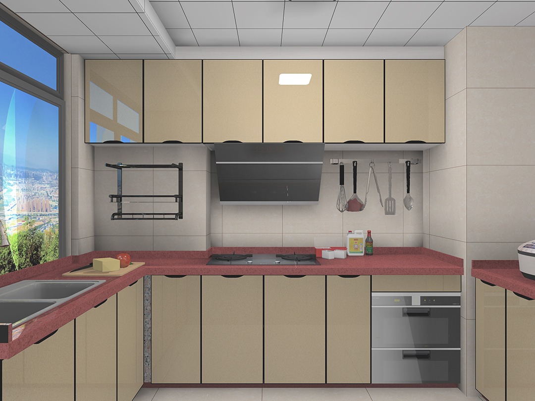 廚房是U型結構,按著勞動動線設置洗手臺→切菜區→裝盤區→烹飪區,做飯不累,多一個人幫忙也不會亂。