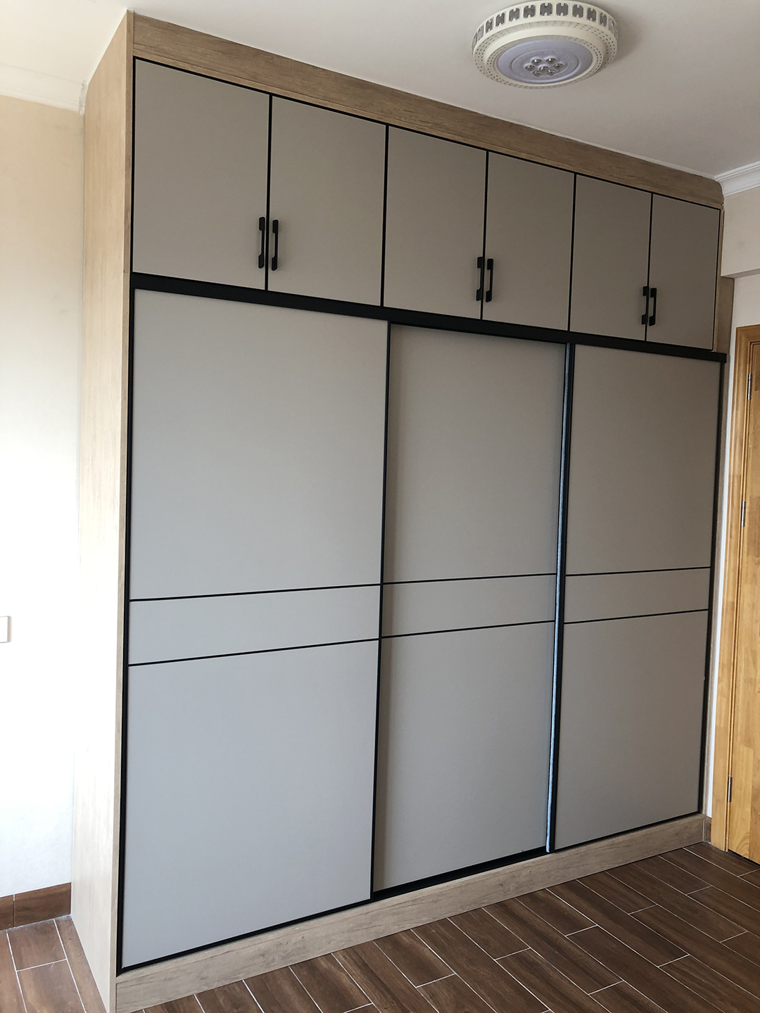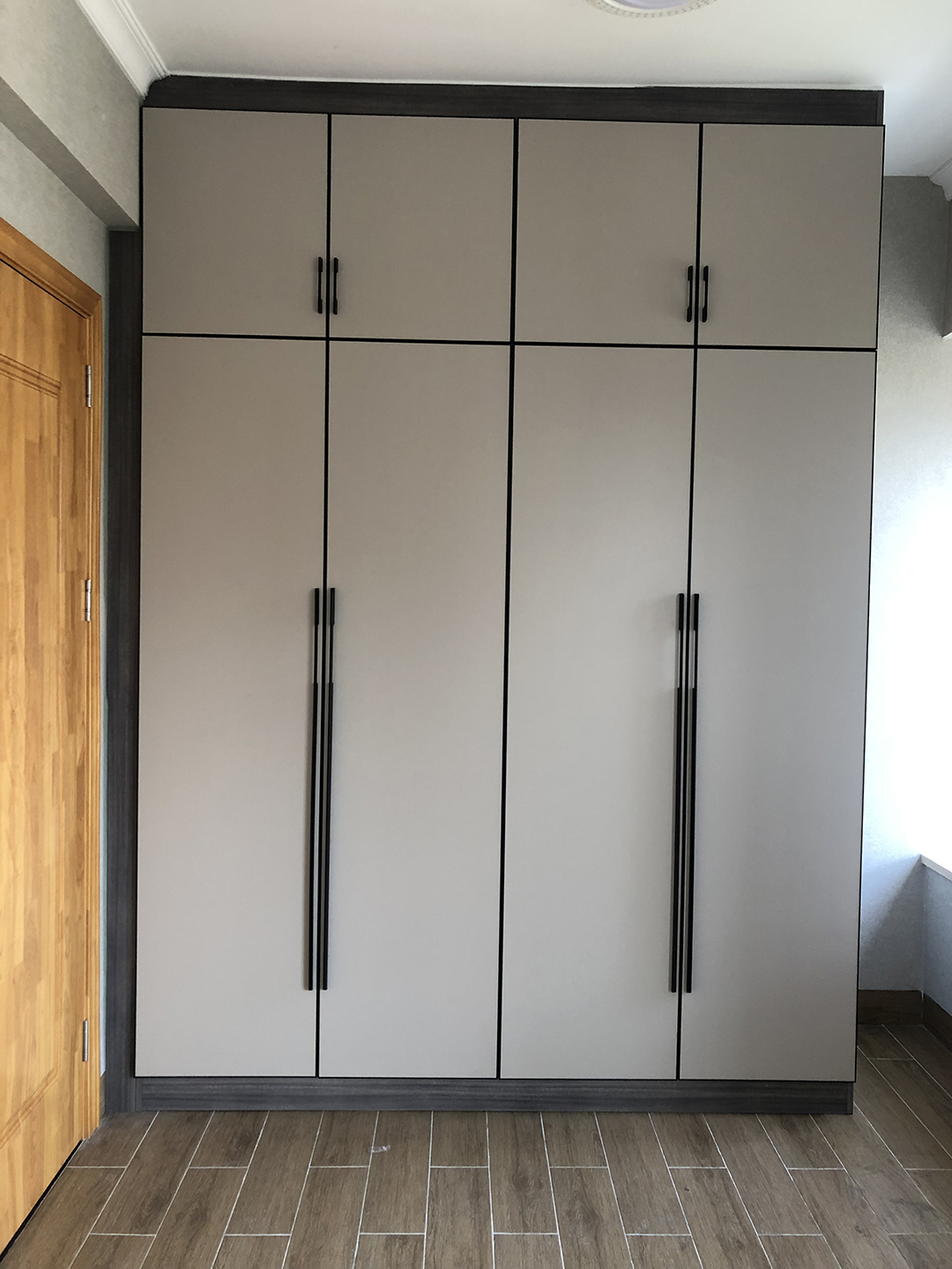 兒子房衣柜采用掩門設計,柜體是焊接整板北歐松木灰,門板與整屋相呼應,膚感卡其門板搭配一字型黑色長拉手,簡約又時尚!