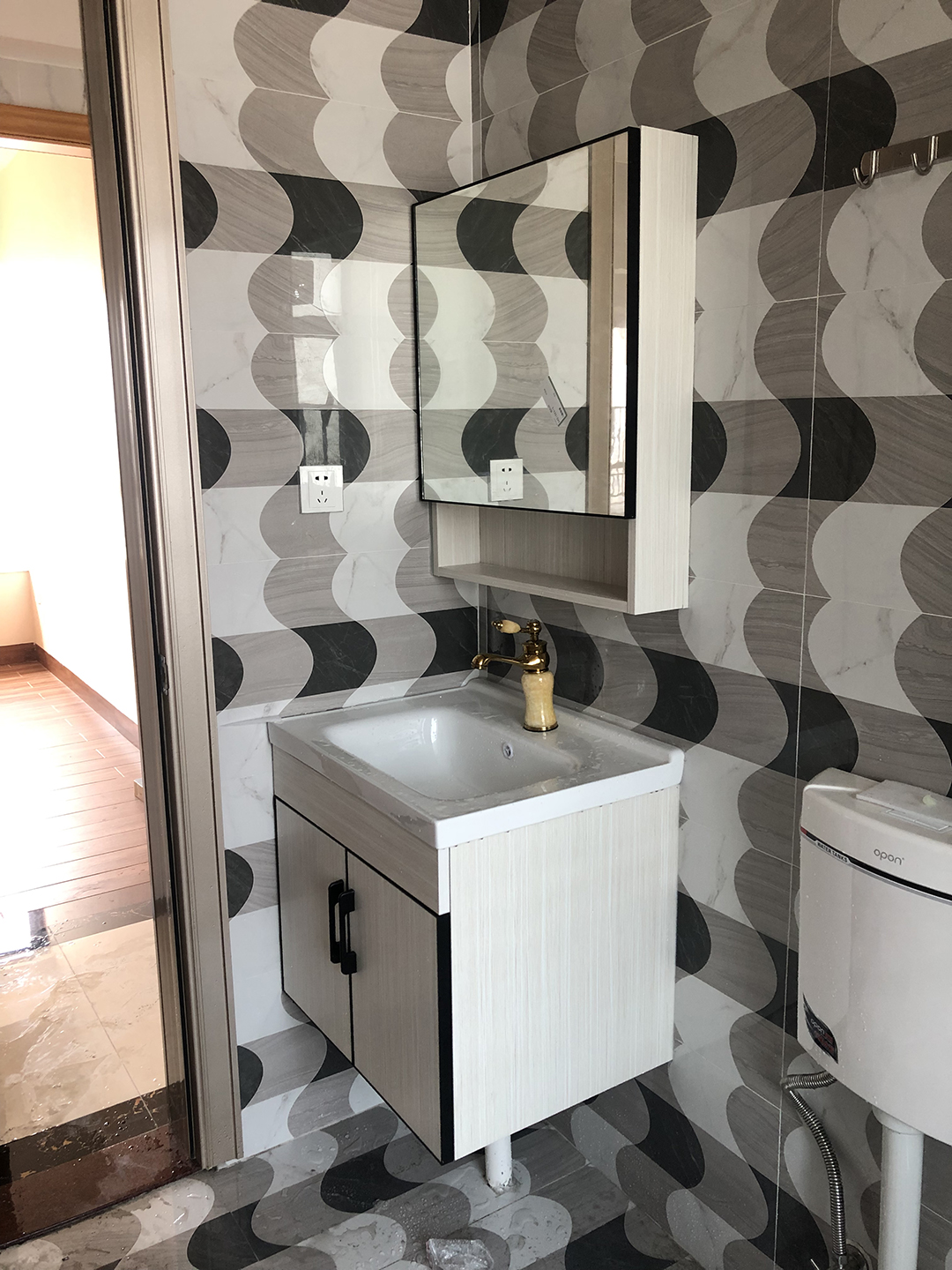 公衛也采用壁柜式全鋁浴室柜,柜體和門板都是星空灰,鏡柜增加收納,全鋁浴室柜防水防潮防蟲蛀,結實耐用不變形。