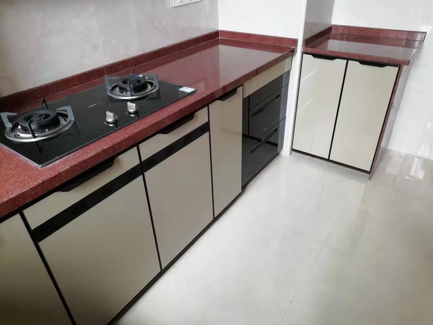 柜體是焊接整板北歐書香桐,門板與餐邊柜相呼應是膚感卡其,搭配拇指款拉手,簡單大氣,膚感卡其門板具有抗油污功效,一擦就干凈,灶具下方門板嵌入透氣條更安全。