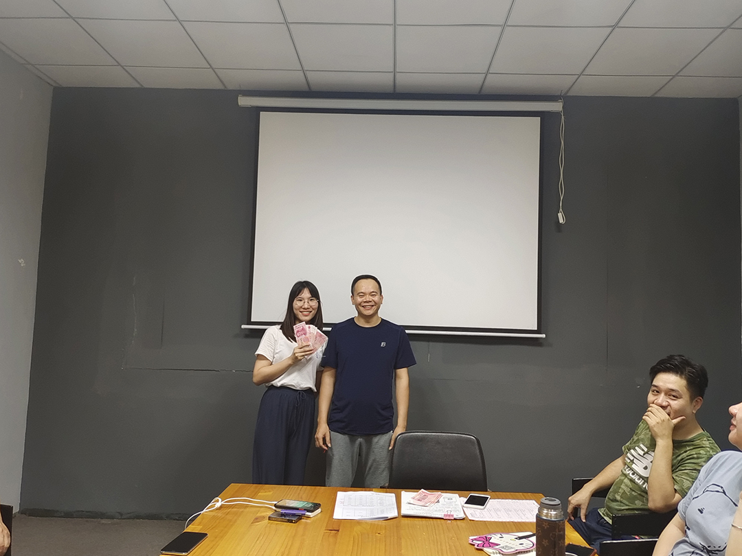 最后,到了激動人心的時刻,給上個月完成目標和超額完成目標的同事發獎金,業務部是最能鍛煉人的地方,也是個人成長最快的部門,越努力越幸運,望業務部全體員工再接再厲,年底賺更多的錢回家過年,一起加油!