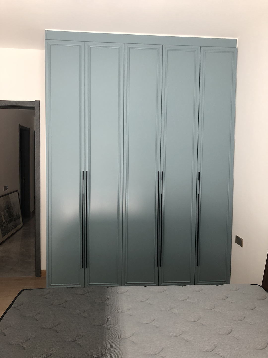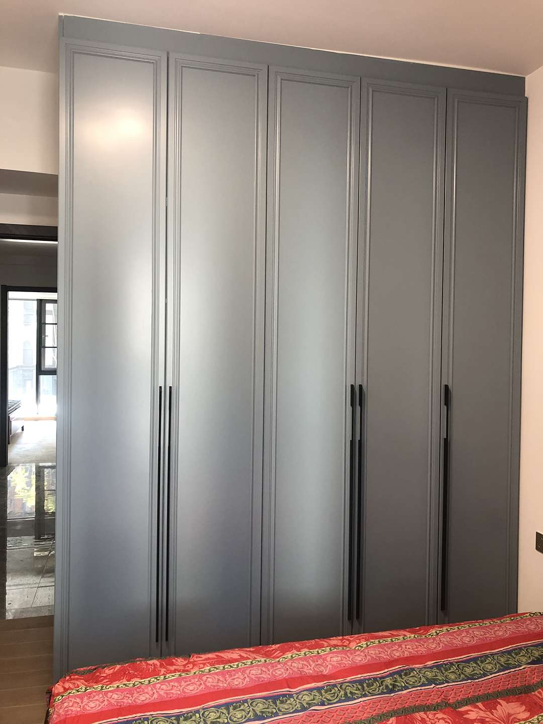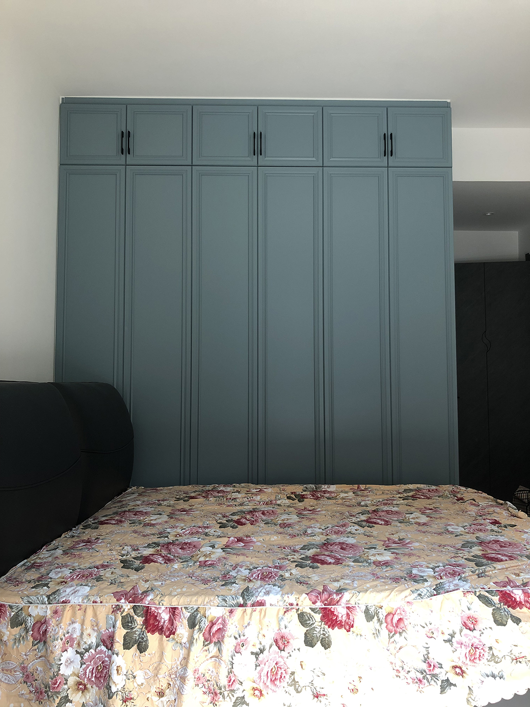 主臥入戶做了一個轉角衣帽間,更具隱私,柜體和門板都是肌膚藍,60框門板搭配一字型黑色拉手,高端大氣,一邊中間挖空設計,整體不壓抑。