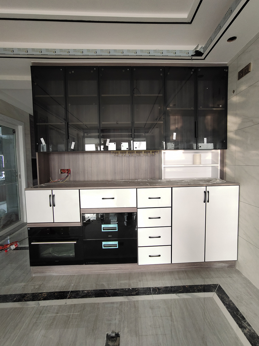 餐邊柜柜體是北歐松木灰,中間挖空設計,裝上簡易杯架放紅酒杯非常方便,上柜裝玻璃門更通透。把消毒柜和烤箱嵌入餐邊柜可以減輕廚房儲物壓力,地柜柜門用極簡框珠光閃銀白,整體不壓抑。