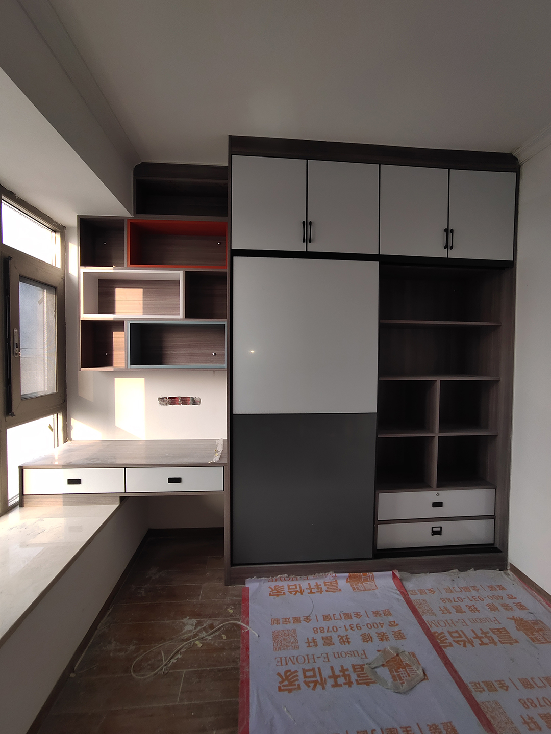 兒子房利用飄窗墊高定制了書桌柜+衣柜組合,衣柜也是做的上掩門下移門結構,書桌吊柜做的是開放式層板,用肌膚藍、天使白和愛馬仕橙三種顏色做了三個錯位套格做造型,層次感就上來了。