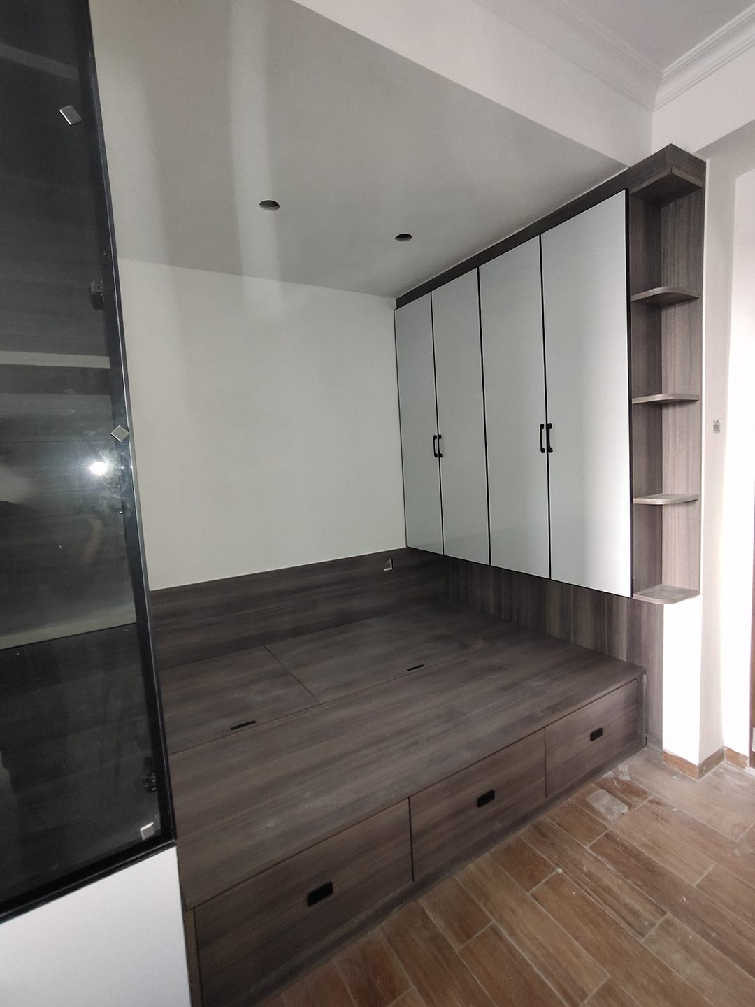女兒房做了玻璃門儲物柜+榻榻米床+衣柜組合,榻榻米床沿一邊做了抽屜,內部也可上翻打開,收納非常足,衣柜做成壁掛式吊柜,不占用床的空間,轉角圓弧設計不怕磕碰。