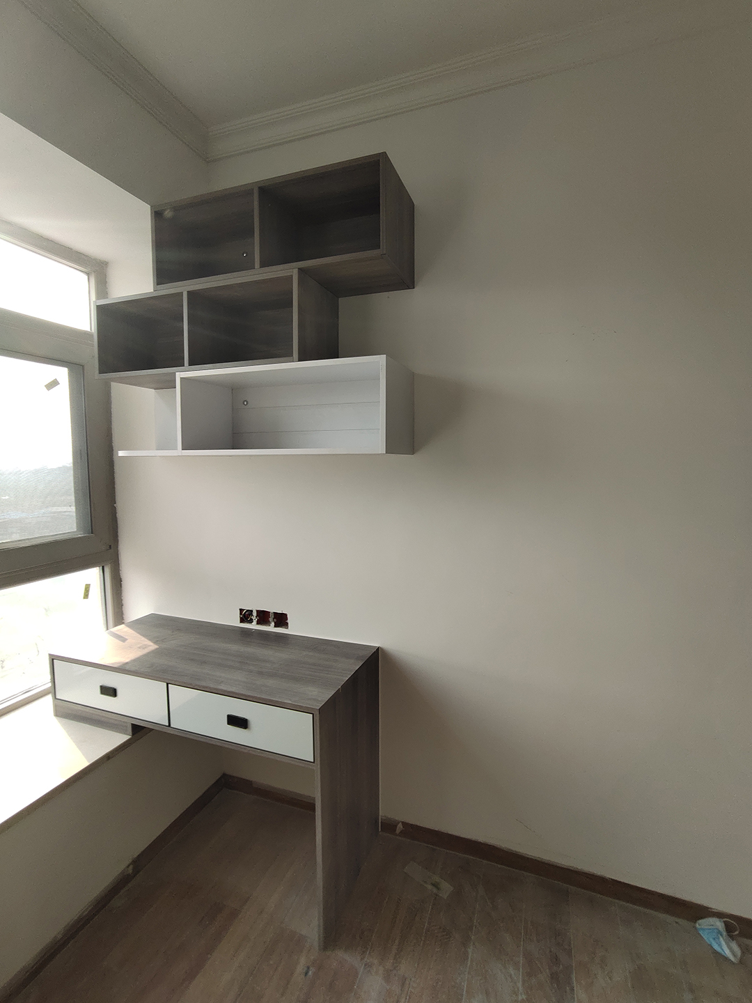 女兒房靠飄窗也做了一個書桌柜,與兒子房類似,飄窗墊高做成書桌,吊柜用北歐松木灰和天使白兩種顏色做成開放式錯位格,整體統一和諧,簡單實用。