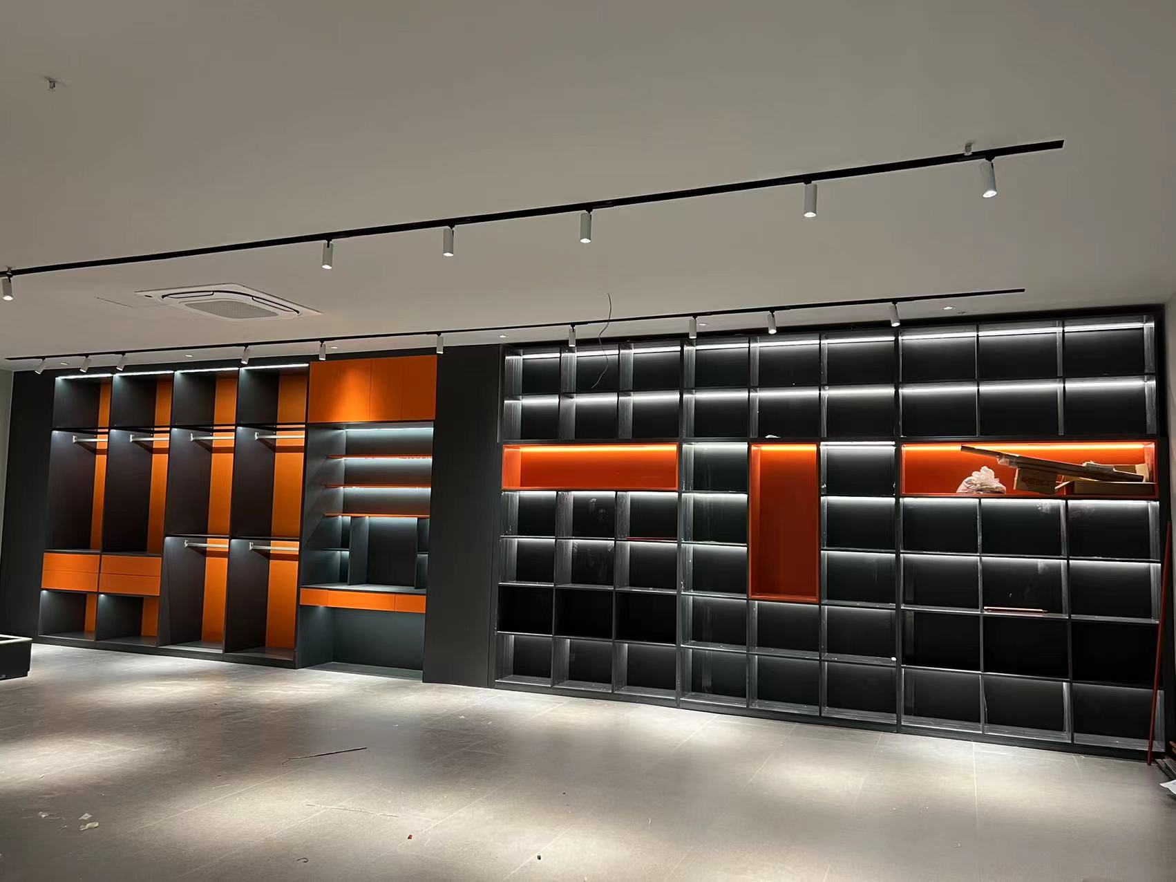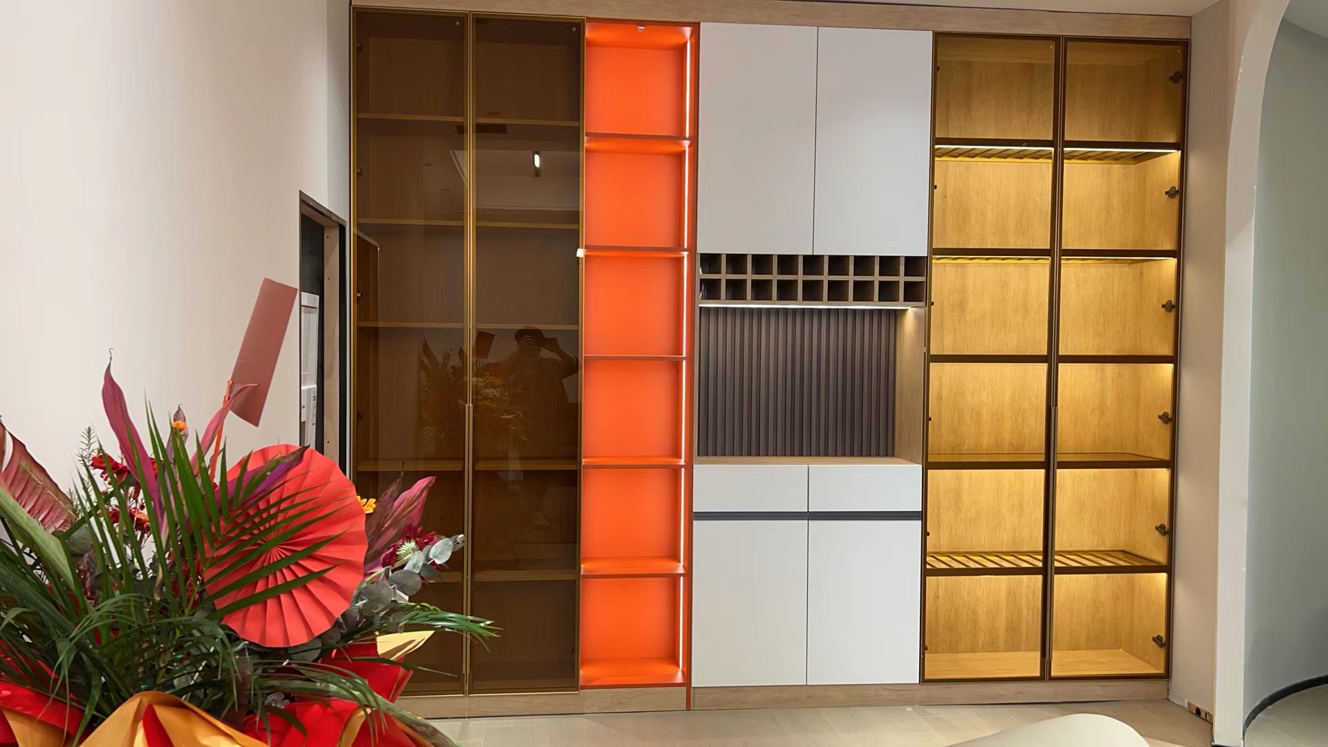 這個客戶定制的是輕奢風格,衣帽間色彩搭配是亮色系,一進屋抬眼看時眼前一亮,柜體主題色用的是北歐榆木和愛馬仕橙,加上燈帶后,氛圍感拉滿。中間是白色門板,裝上茶玻的柜體,頗有寧靜致遠的風格,低調輕奢。整體并不會覺得因為顏色多而產生視覺亂的感覺。