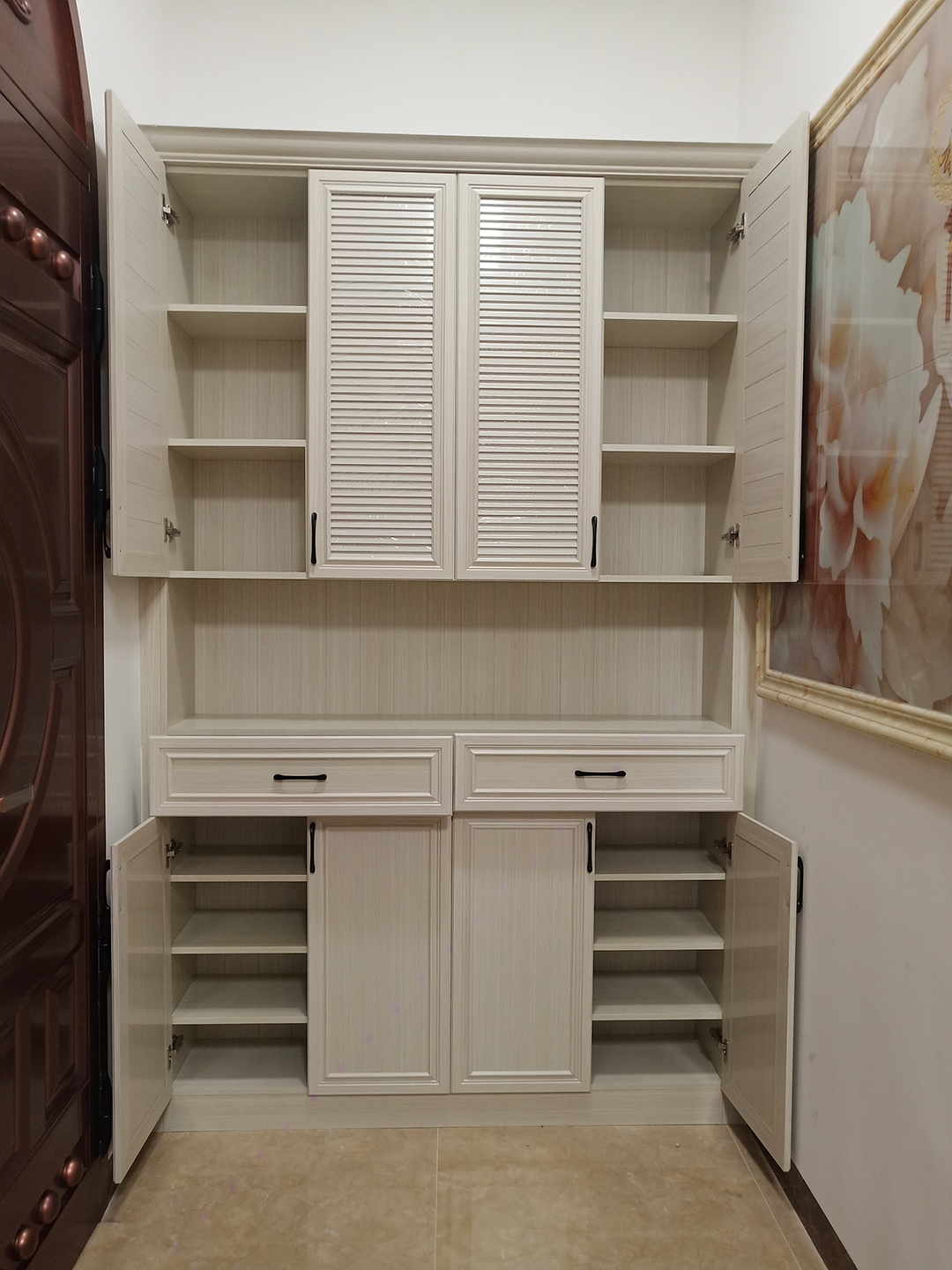 是這幾年比較流行的一種款式,可以根據(jù)客戶自身需求設(shè)計(jì)出一款鞋柜,按照客戶的習(xí)慣將鞋子和雜物收納起來(lái)。